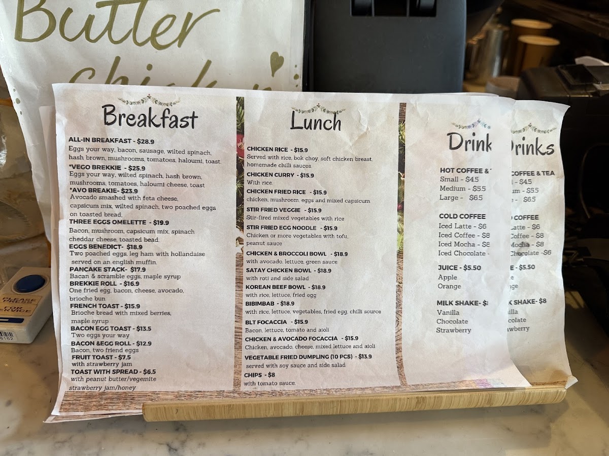Breakfast selections include classic and contemporary dishes such as AllIn Breakfast, Three Eggs Omelette, Eggs Benedict, Pancake Stack, Brekkie Roll, French Toast, Bacon Egg Toast, Bacon & Egg Roll, Fruit Toast, and Toast with Spread. These options provide a range of choices from hearty meals to lighter toast-based items.